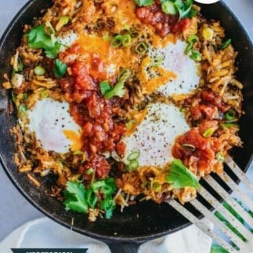Want a hearty, savory breakfast that doubles as a tasty simple dinner? Try this breakfast skillet! Cheesy hash browns topped with runny egg yolks and salsa? Yes please! Even better, the spices in the potatoes mimic breakfast sausage so the entire vibe is extremely hearty and satisfying.