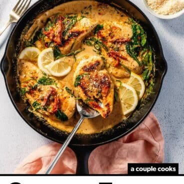If we could eat just one dinner for the rest of our lives, this might be it: a skillet of creamy Tuscan chicken! What is it that makes it so outrageously good? Maybe it’s the dreamy sauce of sun dried tomatoes, spinach, garlic, and Parmesan. Or maybe it’s the savory flavor explosion from the pan seared chicken breast.