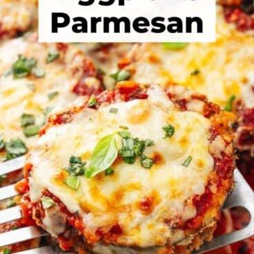 This baked Eggplant Parmesan recipe (aka eggplant parmigiana) is classic Italian comfort food at its finest, with crispy eggplant rounds, savory marinara, and gooey cheese. We’ve tested our recipe over and over to make it easier than most homemade versions, and it’s a total crowd pleaser!