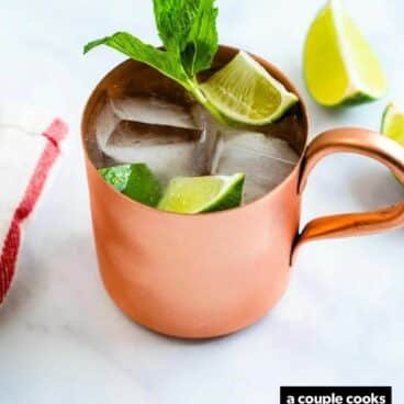 Tips for buying mugs: If you’re buying Moscow Mule mugs, look for solid copper rather than copper-plated stainless steel. Food-safe copper (or copper-lined with stainless steel on the inside) is best. Here’s a set of solid copper Moscow mule mugs I recommend Don’t have a copper mug? No problem: a highball glass, copper cup, or any tumbler works, too!