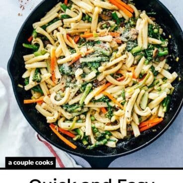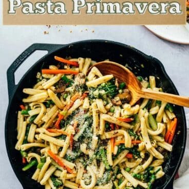 Looking for a fresh and fun dinner idea? Try Pasta Primavera, the veggie-filled pasta here to liven up your dinner! As two cookbook authors, we created this delicious spin to highlight the vegetables of the season (and not copy popular restaurant versions of the dish!). Here, tender pasta is mixed with spring vegetables like asparagus, broccolini, peas and carrots. It’s tossed in a light and creamy sauce and comes together in under 30 minutes, making it the ideal weeknight meal!