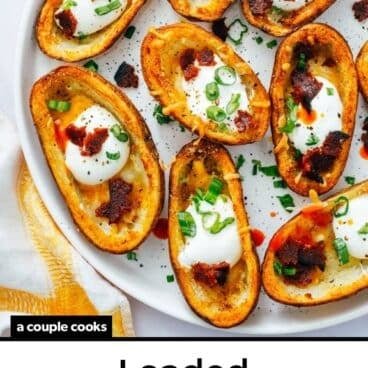 If you’re serving a big party, you may want to consider making a double recipe here. Use the 2x recipe button below and two large trays in your oven. The only note is that the bake times may be slightly longer, since you have more surface area to bake in the oven. The recipe will likely also take you slightly longer to assemble, with more potatoes to scoop and top.