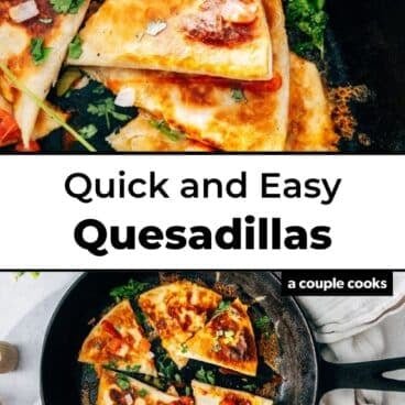 Want to make more quesadillas at once? Try my Baked Quesadillas, It turns this recipe into a super easy dinner by baking up a big batch all at once on a sheet pan. All the quesadillas are done at the same time, and they come out with a beautifully crispy exterior.