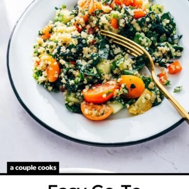 A kale quinoa salad with chickpeas makes a hearty lunch. For something lighter, try arugula with fresh lemon, pine nuts, and shaved Parmesan. You could also add roasted vegetables like roasted butternut squash for a fall-inspired version. Check out my full list of quinoa recipes for more ideas.