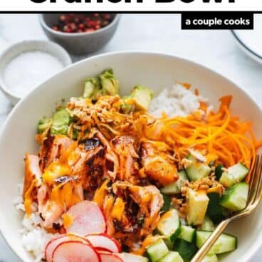 LOVE this recipe. I did the marinated salmon and broiled it. Used veggies I had (shredded carrots, avocado, mini cucumbers, edamame) no radish. Fiancé said it was restaurant level meal! Thank you! Onion crispies are amazing addition btw so don’t skip those!