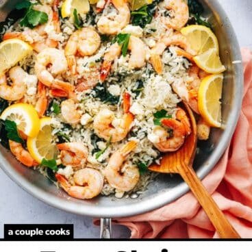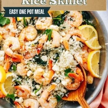 This shrimp and rice recipe is a one-pan dinner everyone will love! It’s flavor-packed with juicy shrimp, tender rice, lemon, garlic, and spinach.