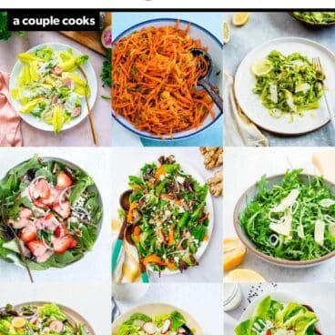 Last up in our top spring salads: easy Arugula Salad! Introducing: the simplest arugula salad. It’s quite possibly the easiest salad recipe you’ll make! You don’t even have to make a salad dressing. In under 10 minutes, you’ve got an elegant salad that goes with literally everything. Dress baby arugula simply with olive oil and lemon juice, then add Parmesan shavings and thinly sliced shallots. Done! Simple, understated, and oh so good.