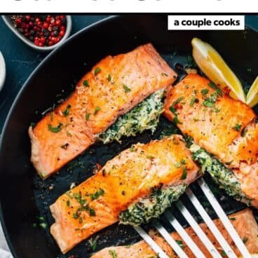 This stuffed salmon recipe is a simple weeknight dinner ready in 30 minutes that’s impressive every single time! Flaky, pan-seared salmon pockets are filled with a creamy, savory spinach artichoke filling.