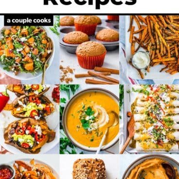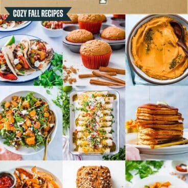 Here’s a great sweet potato recipe for any season: Sweet Potato Black Bean Tacos! Throw almost any seasonal veggies onto a sheet pan, season them up, and they work as a delicious taco filling! The best part: you can add the black beans right on the roasting pan. It comes out zingy and delicious: top with pico de gallo, cheese crumbles, and a dollop of sour cream.