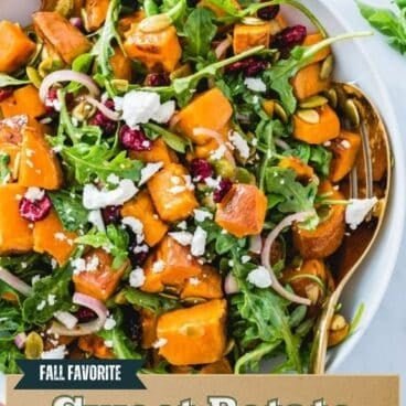 The tender garlicky roasted potato cubes, baby arugula, tart cranberries, and creamy goat cheese are topped off with a tangy honey mustard dressing. It’s so delicious, l typically just park myself in front of the bowl! It’s a great side dish for any fall or winter meal, or holidays like Thanksgiving and Christmas dinner. You can even top it with protein to make a main dish!