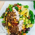 This taco salad recipe is flexible enough to feed any eater. Around here we eat a lot of vegetarian and vegan recipes. But when we serve a crowd, we want a concept that works for everyone. This recipe is a classic taco salad, vegan taco salad, and healthy taco salad: all in one! That, in our minds, makes this one stellar meal worth putting in your regular rotation. Here are the two types of taco meat to use, vegan or classic:
