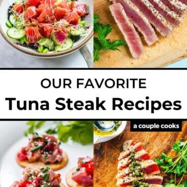 Got a slab of bright pink tuna steaks? This luxuriously buttery, mild fish is unique and versatile. Ahi tuna, a term that includes both yellowfin tuna or bigeye tuna, is commonly served as sushi, in poke bowls, or cooked rare or medium-rare like a big juicy steak. Here are all our favorite fresh tuna steak recipes for turning it into dinner: both cooked and raw! Along with selections from this website, we’ve featured selections from the websites Simply Recipes and Skinny Taste.