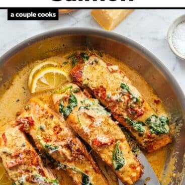 There are salmon recipes and then there’s this creamy Tuscan salmon. It might result in a few marriage proposals, which is why we also like to call it “Marry Me Salmon!” The tender fish is bathed in a luscious cream sauce with garlic, sun dried tomatoes, spinach, and capers, making each bite bright, salty, and luxurious. It tastes restaurant-style, but it’s easy to whip up at home in just 30 minutes. Honestly, it might be the best salmon recipe we’ve made!