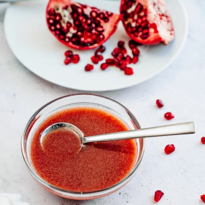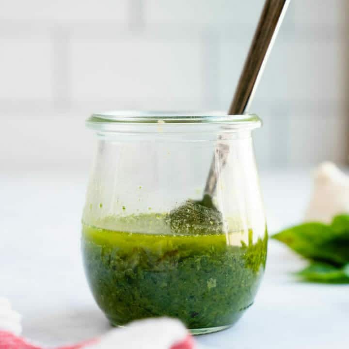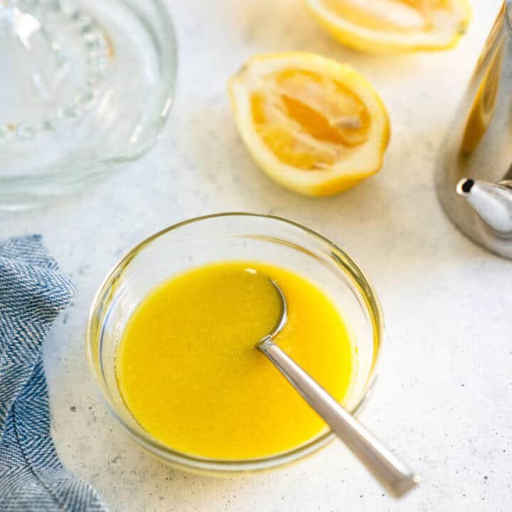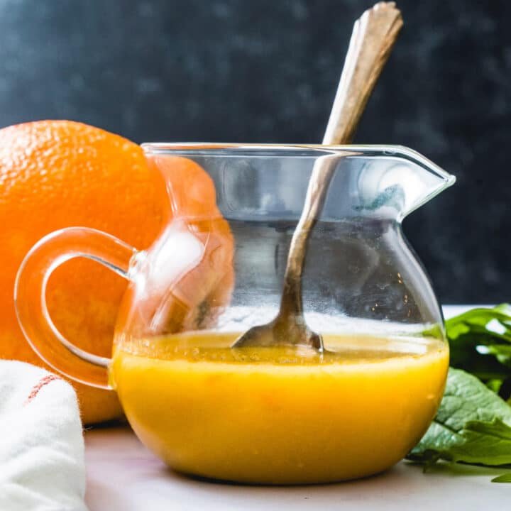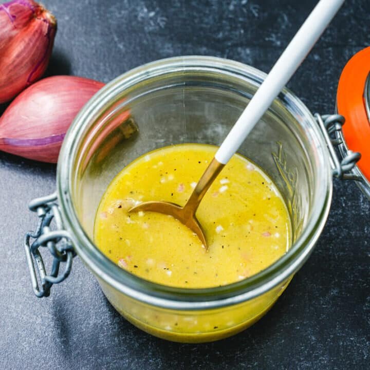This easy vinaigrette recipe makes ½ cup of dressing. If you don’t plan to use it all at once time, it’s very easy to store. This one technically can be stored in the pantry or at room temperature, since it doesn’t have fresh ingredients like garlic or fresh herbs. The advantage to this method? The vinaigrette doesn’t solidify in the refrigerator.